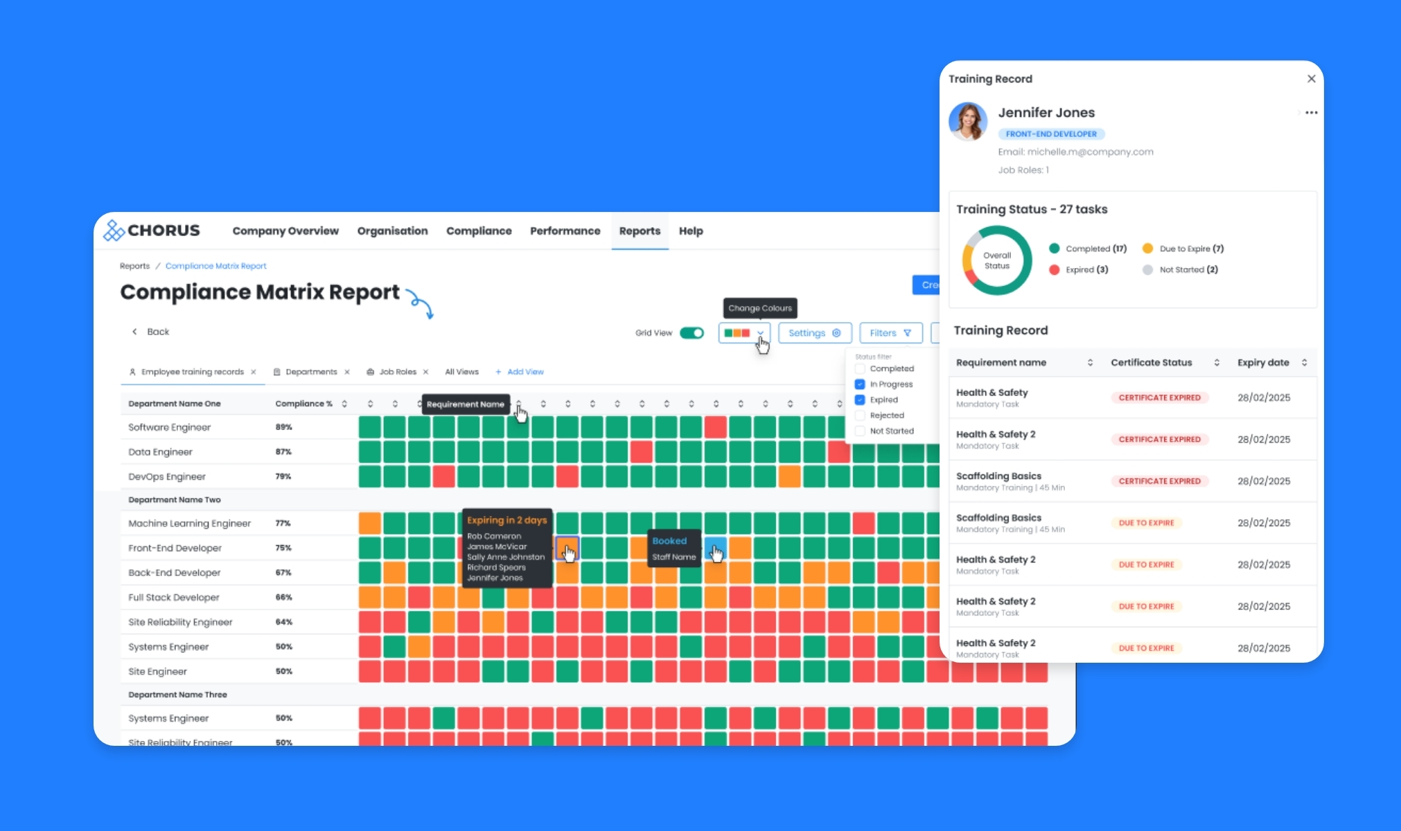 Interactive, colour-coded matrices, that you can filter, show which employees have completed onboarding, whose is overdue and where the risks are.